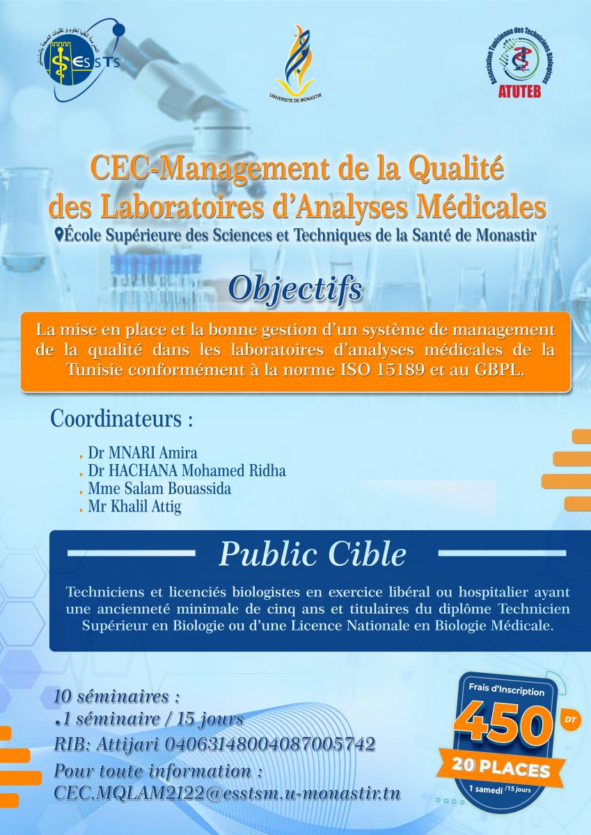 La mise en place et la bonne gestion d'un système de management de la qualité dans les laboratoires d'analyses Médicale de la Tunisie conformément à la norme ISO15189 et au GBPL.