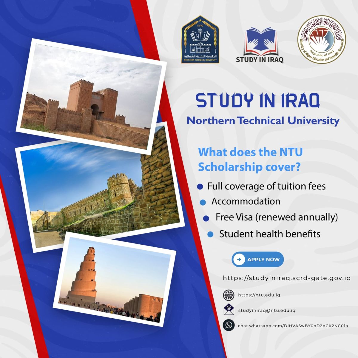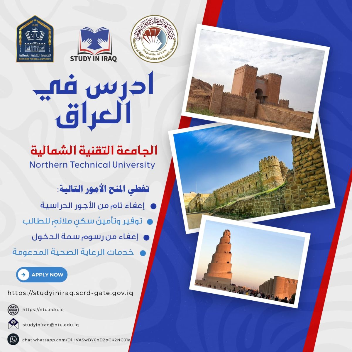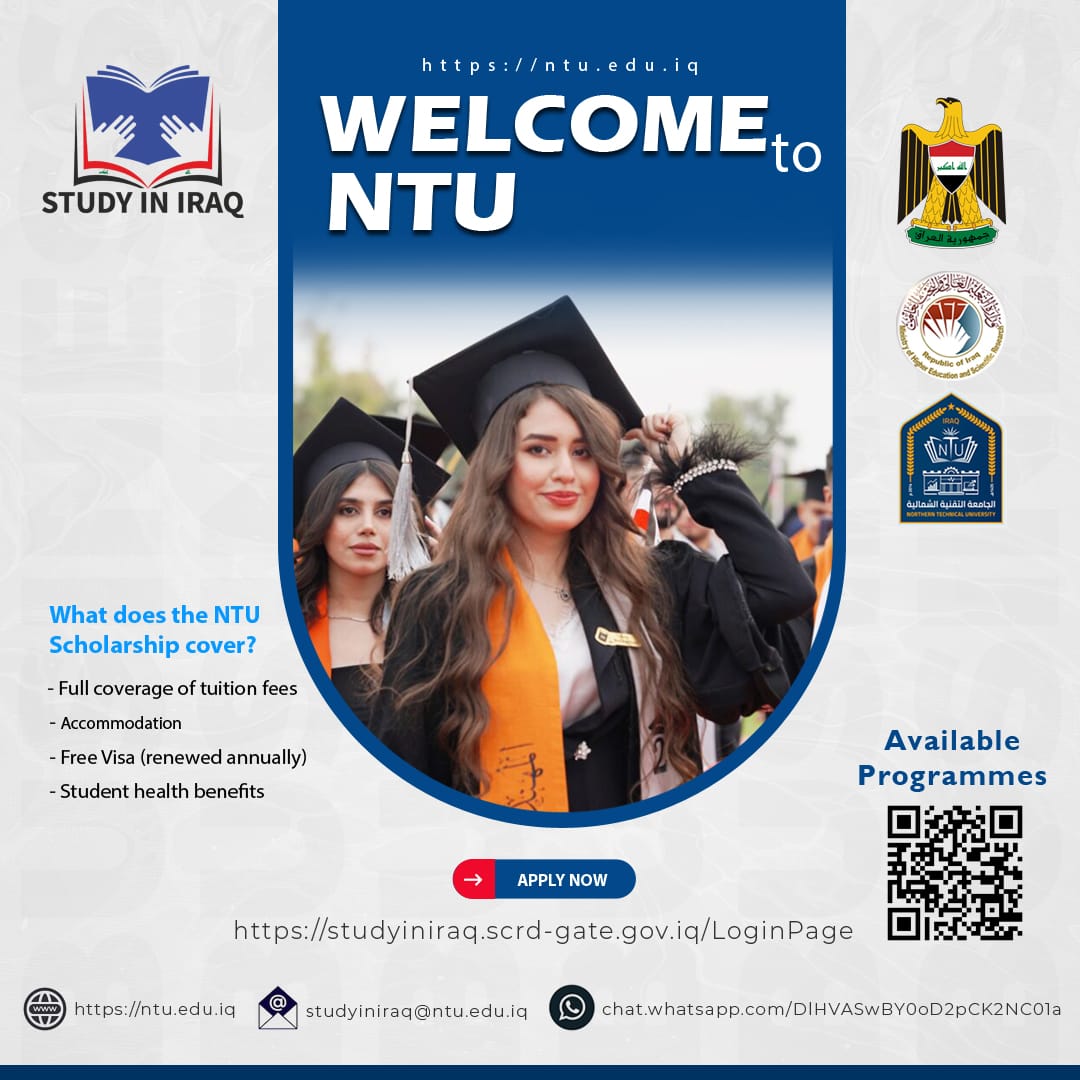 studyiniraq@ntu.edu.iq :جميع التفاصيل ستكون متاحة في الإعلان المرفق. وللمزيد من المعلومات حول برنامج المنح، يرجى التواصل معنا عبر البريد الإلكتروني