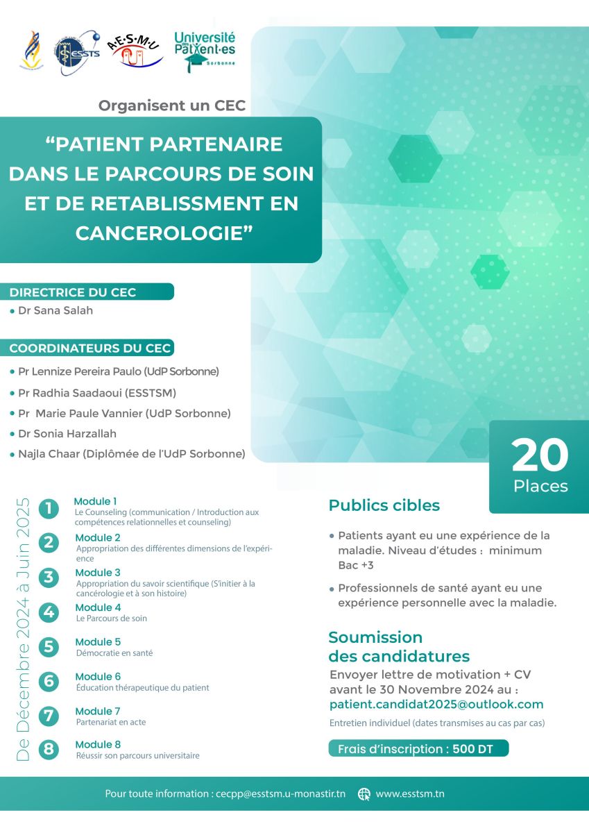 L'Ecole Supérieure Des Sciences et Techniques de la Santé de Monastir en partenariat avec l'Université des Patients Paris Sorbonne vous propose cette formation certifiante unique dans son genre de toute la Tunisie pour devenir patient (e) partenaire.