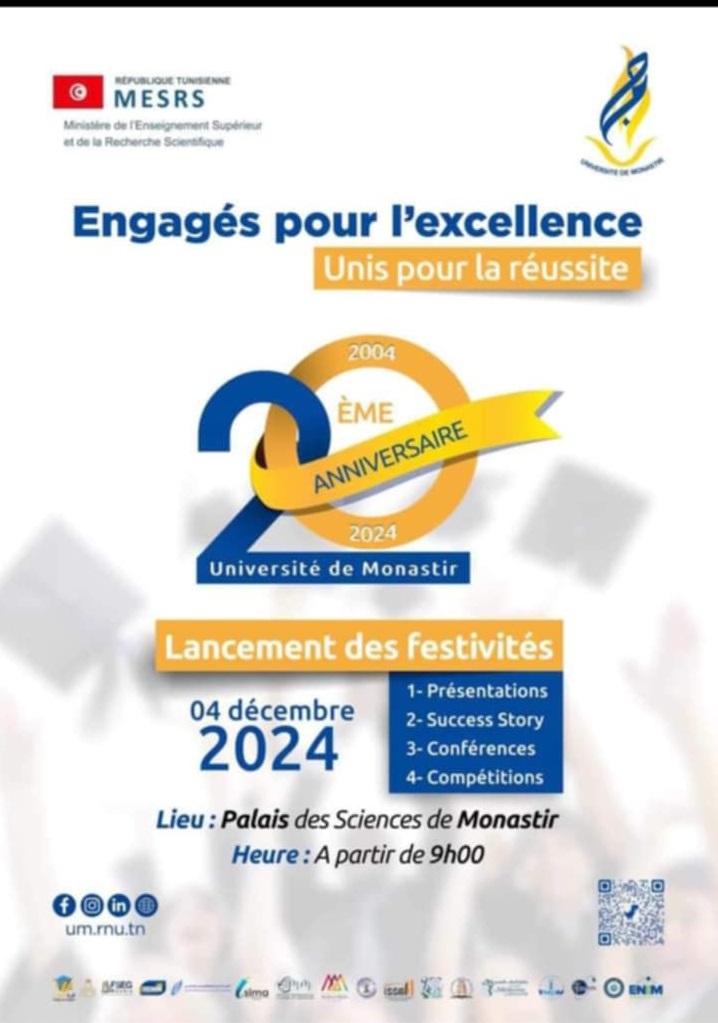 مشاركة المدرسة العليا لعلوم وتقنيات الصحة بالمنستير يوم الاربعاء 04ديسمبر 2024 بقصر العلوم بالمنستير في اطار الاحتفال بعشرينية جامعة المنستير تحت اشراف الأستاذ المنتصر العامري مدير المؤسسة.