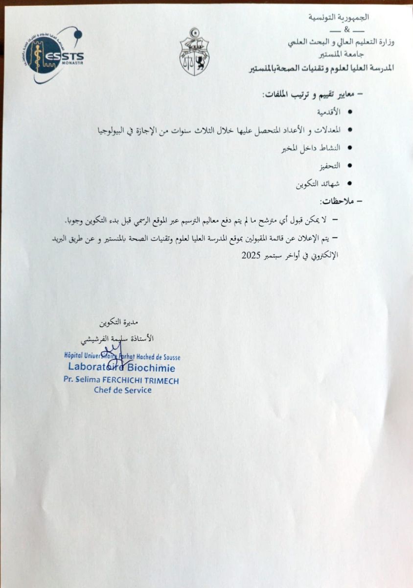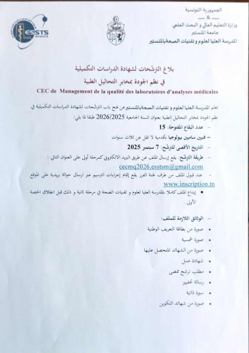 Appel à candidatures pour le CEC de management de la qualité des laboratoires d’analyses médicales 2025/2026
